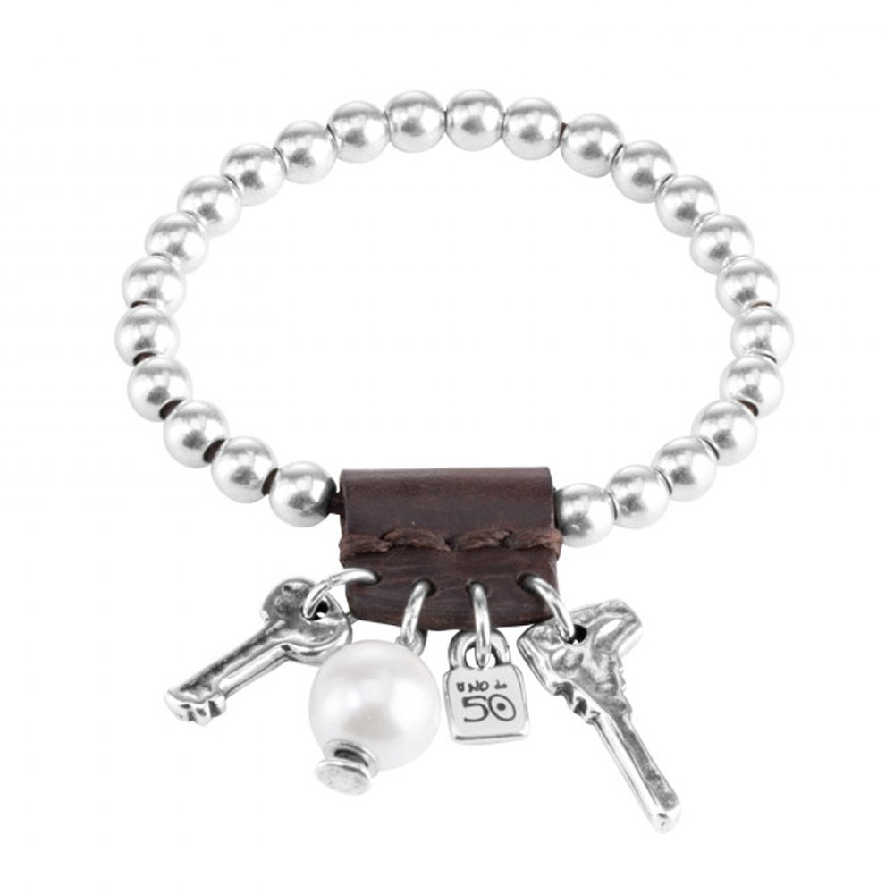Bracciale in metallo placcato argento con pezzo di cuoio Marrone della culegan diversi charms a forma di perla e chiavi Lunghezza: 17 cm