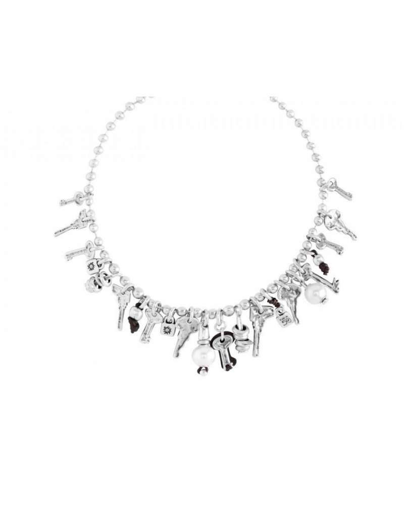 Collana girocollo in metallo argentato e pelle marrone. Realizzata artigianalmente in Spagna.