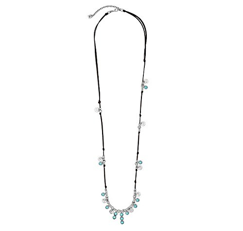 Collana lunga in pelle con pezzi di metallo rotondi con pietre turchesi.