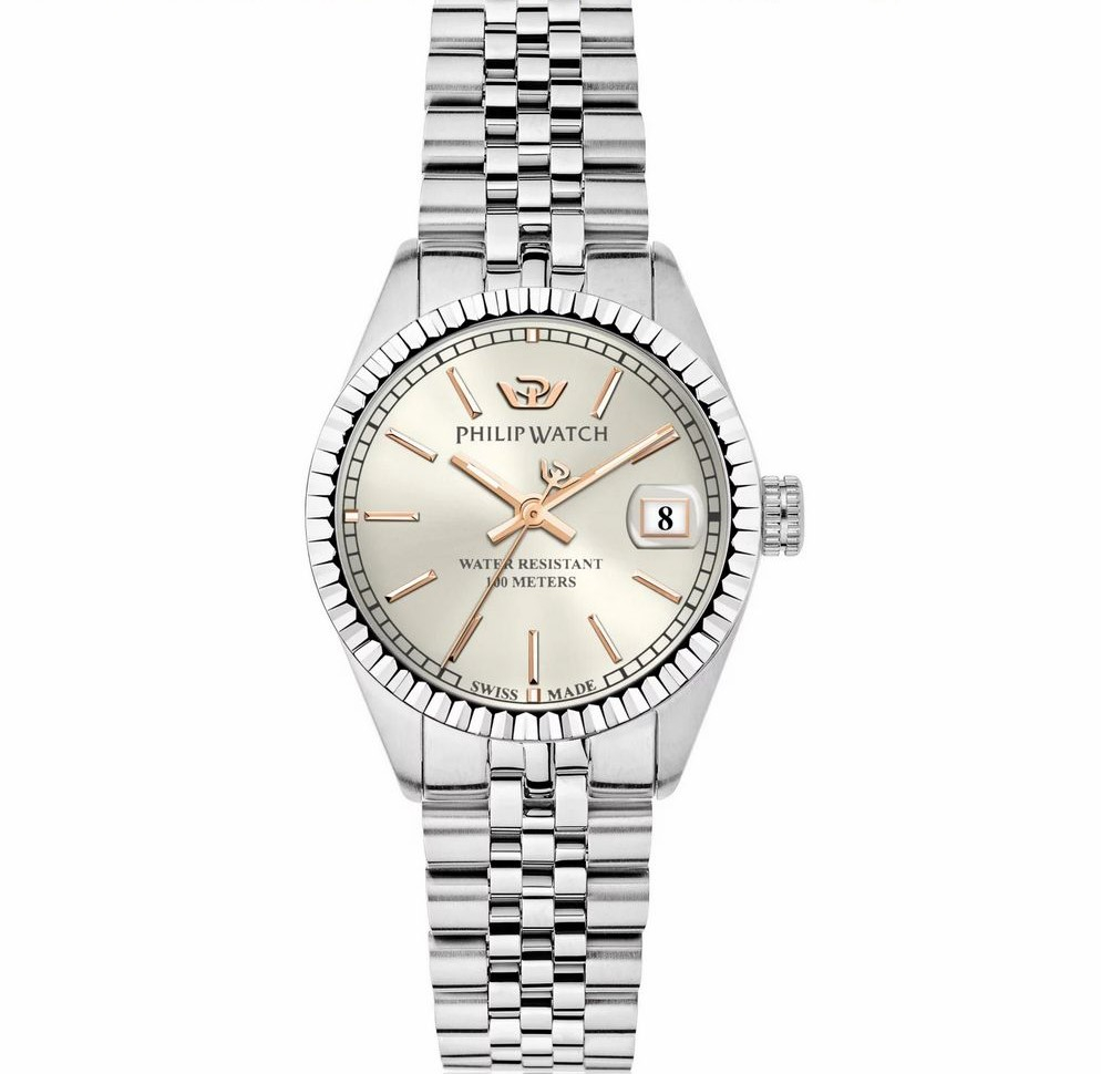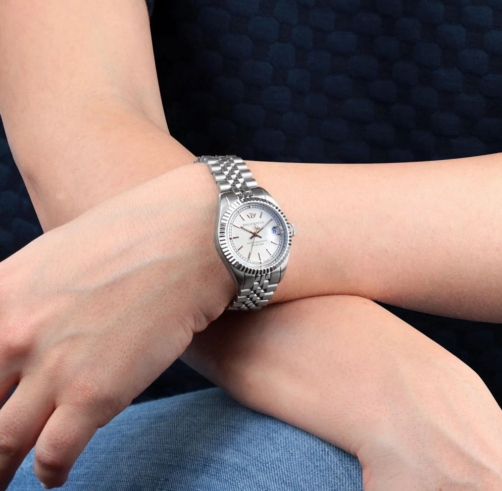 Ancora una volta la collezione Caribe stupisce con orologi da donna impeccabili, come questo modello con bracciale in acciaio e quadrante argento con dettagli rose gold. Luminoso a dir poco, è assolutamente discreto e raffinato, un orologio da indossare ogni giorno, perfetto da mattina fino a sera. Versatile e delicato nelle tonalità, il suo design rivela la profondità della sua storia. Philip Watch infatti si è evoluto nel tempo, ma ha mantenuto saldo il suo stile iconico, italianissimo e di ispirazione vintage. E’ soprattutto nei dettagli che si rivela questa ricercatezza: come nella finitura centrale del bracciale jubilée, nella lunetta zigrinata che incornicia il quadrante, negli indici a contrasto, ma in una tonalità piena di fascino. Da notare è l’indice a ore 12, sostituito dal logo Philip Watch, mentre sul lato destro del quadrante c’è un utile datario con lente di ingrandimento incorporata. Resistenza all’acqua fino a 100 metri di profondità e vetro zaffiro a proteggere il quadrante sono le altre caratteristiche che danno ancora più valore a questo orologio, che alla bellezza e allo stile garantisce sempre resistenza ed affidabilità. Per questo i movimenti, dopo 160 anni, continuano ad essere prodotti in Svizzera: perché il vostro tempo è importante e merita di essere scandito dal miglior strumento possibile.