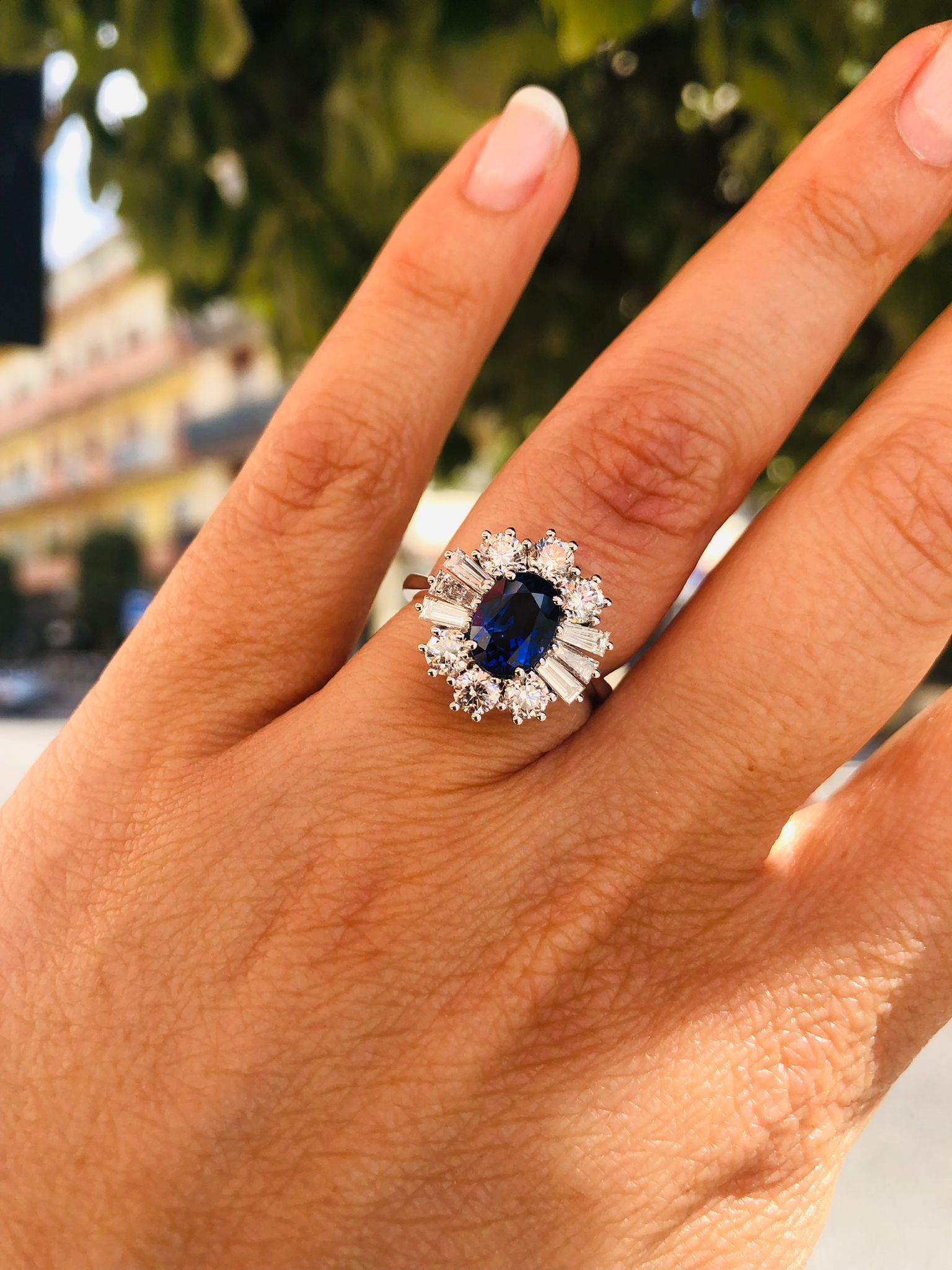 Anello realizzato in oro bianco 18 kt. con diamanti naturali taglio brillante (in foto: caratura circa 2 carati per lo zaffiro e brillanti 1,57)
