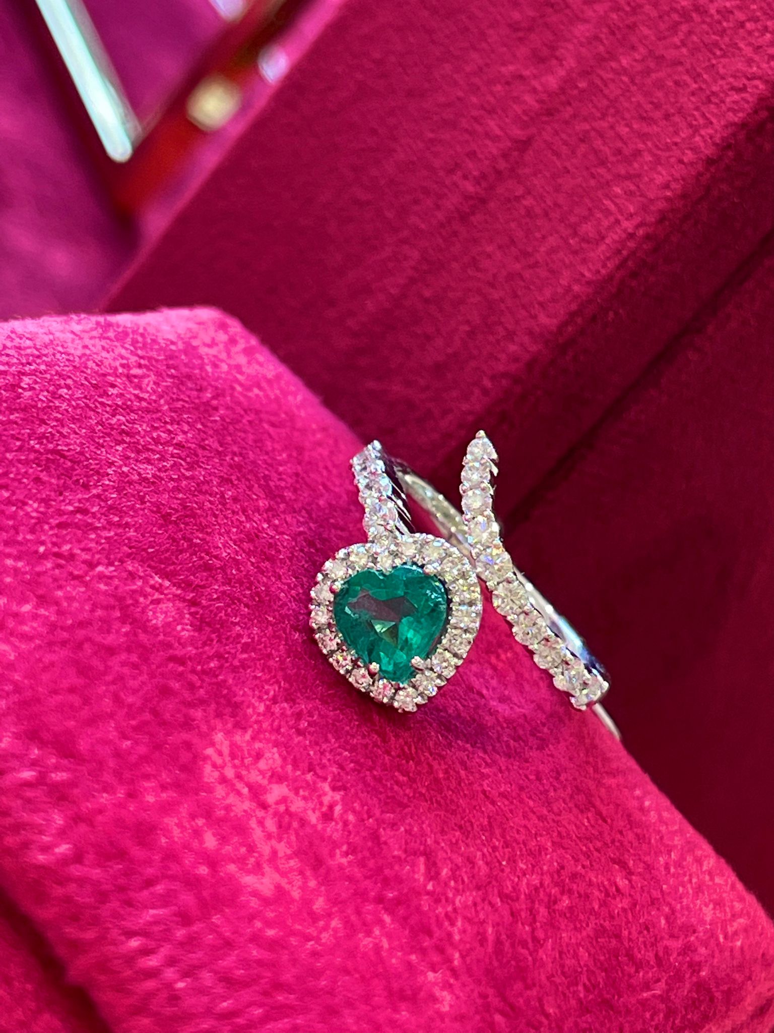 Anello in oro bianco ct. 18 con smeraldo naturale taglio a cuore ct. 1,01 e diamanti naturali taglio brillante ct. 0,62, colore F SI.
