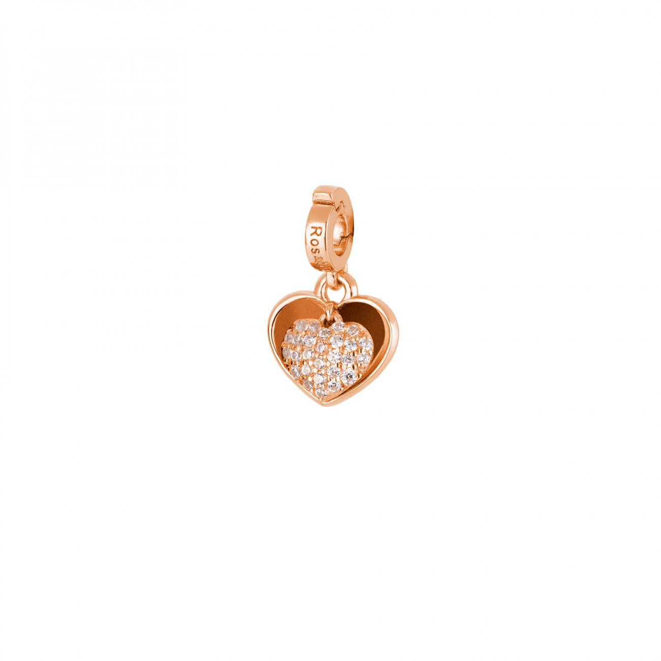 Charm in argento 925‰, galvanica oro rosa, cubic zirconia bianchi e incisione nel retro "Thanks Mom" con smalto bianco. Misura: 17mm
