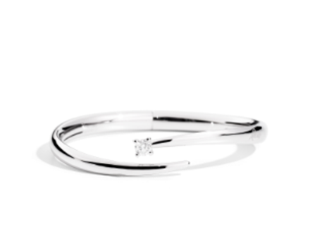 Bracciale rigido con snodo a molla in oro bianco 18 kt e un diamante taglio brillante.