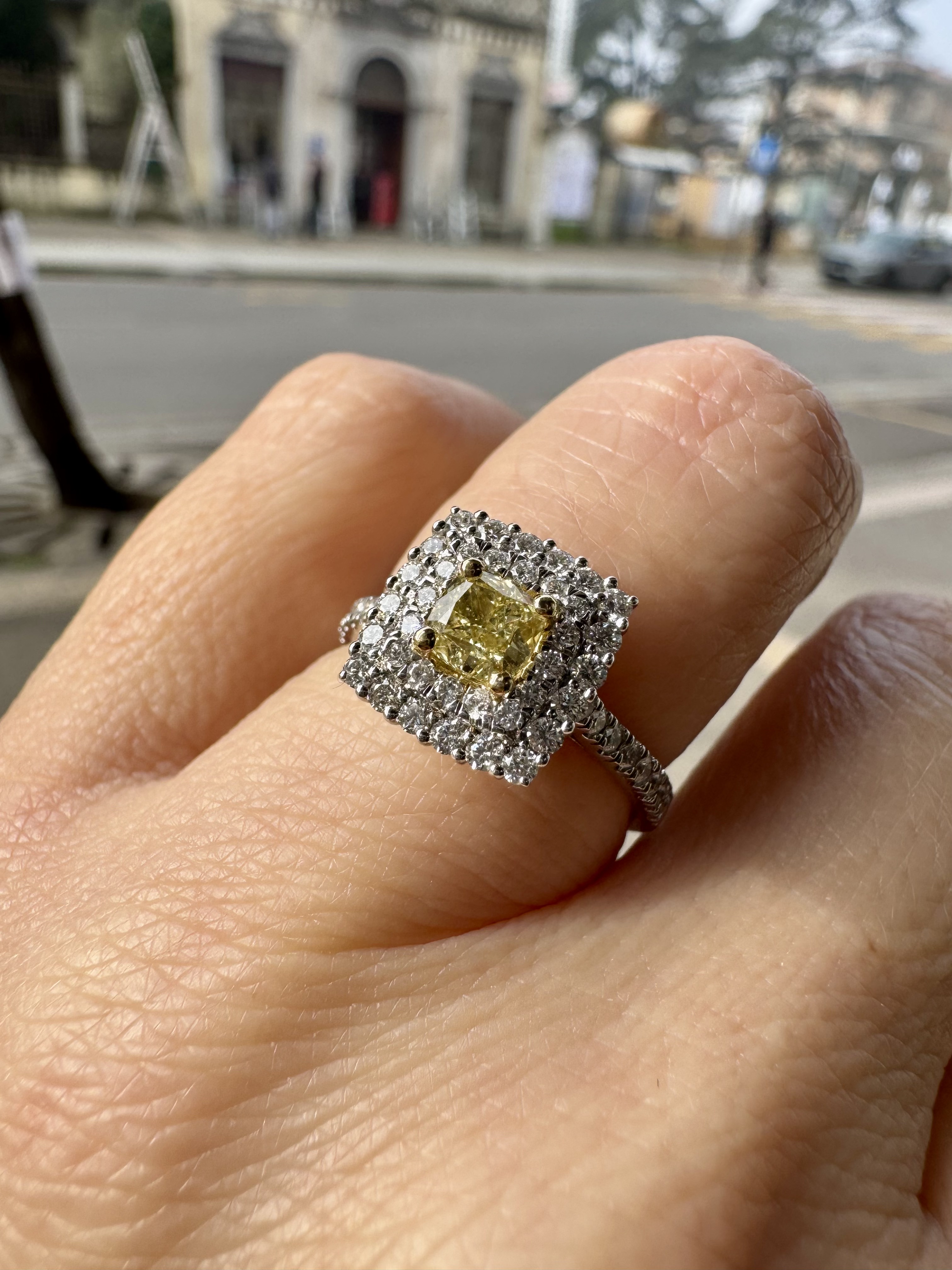 Anello in oro bianco k18 con diamante Fancy yellow centralle taglio cuscino e diamanti naturali taglio brillante a pavè.